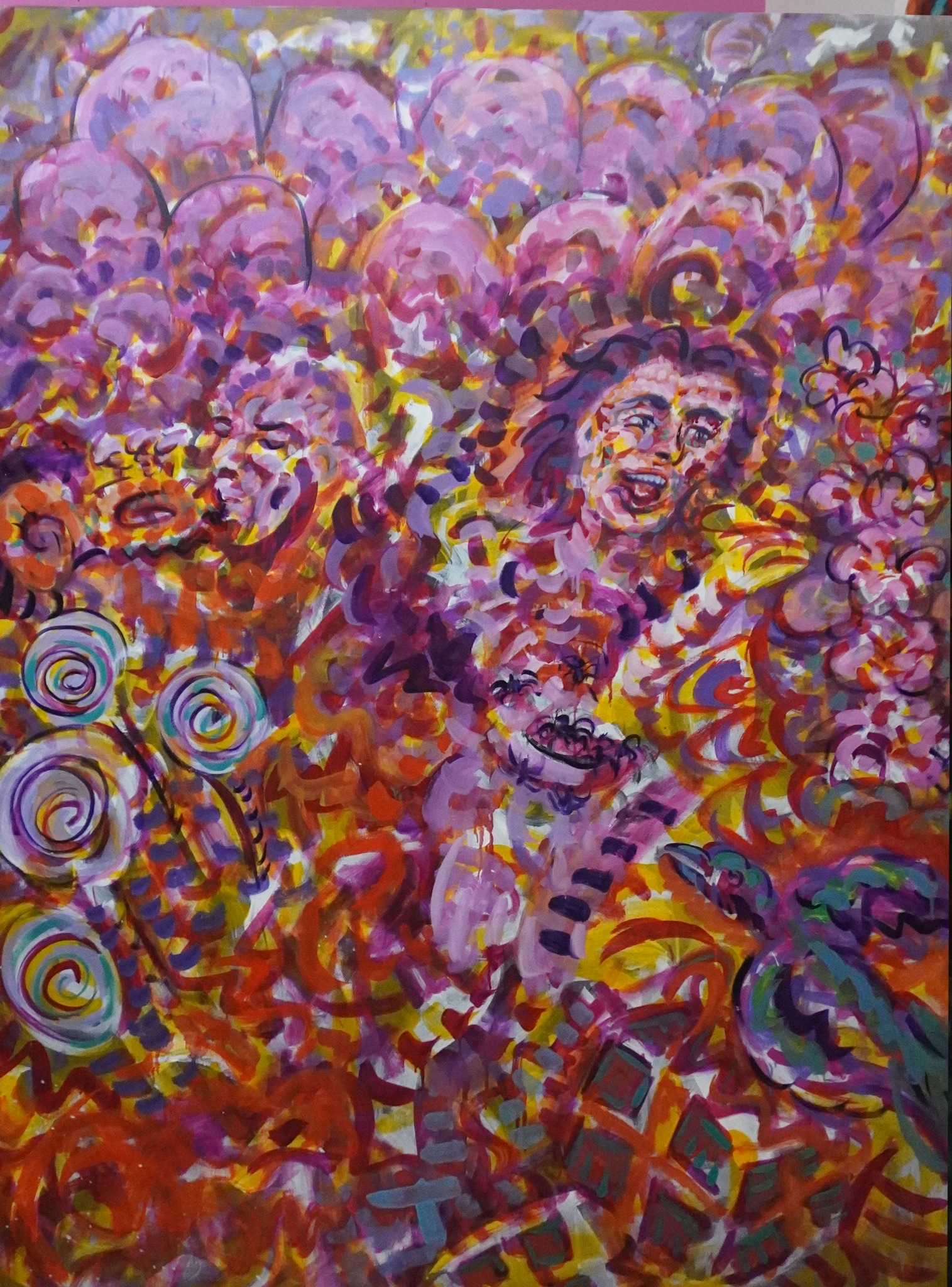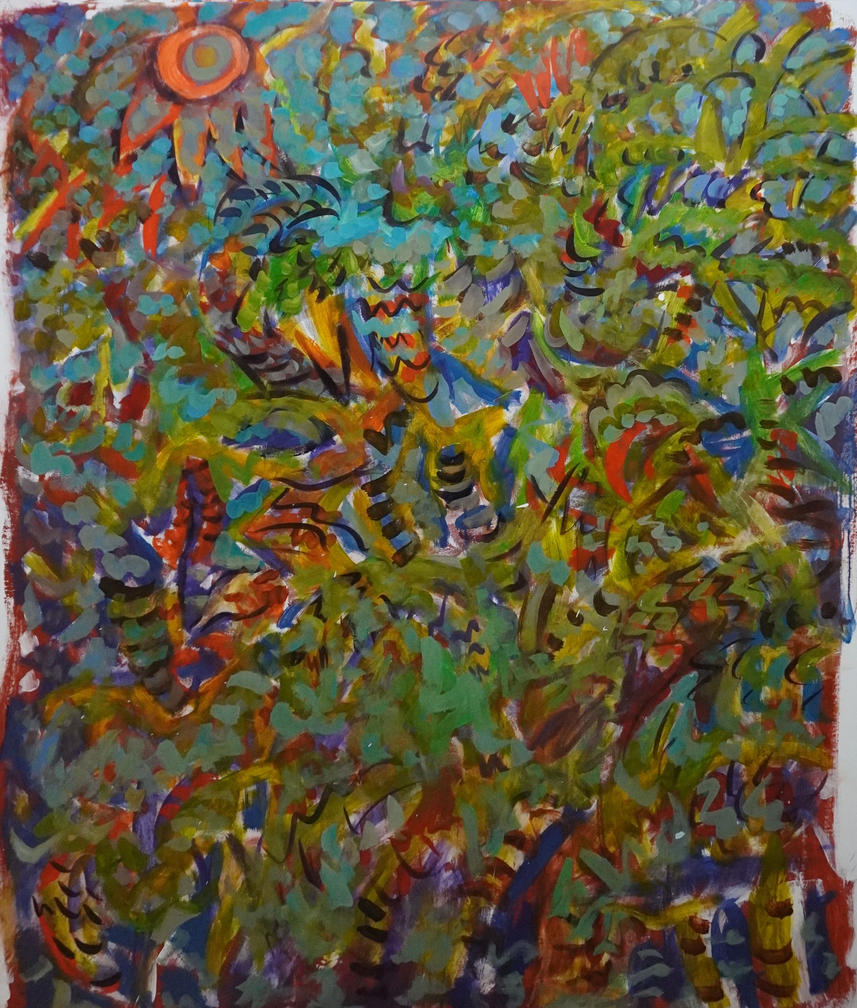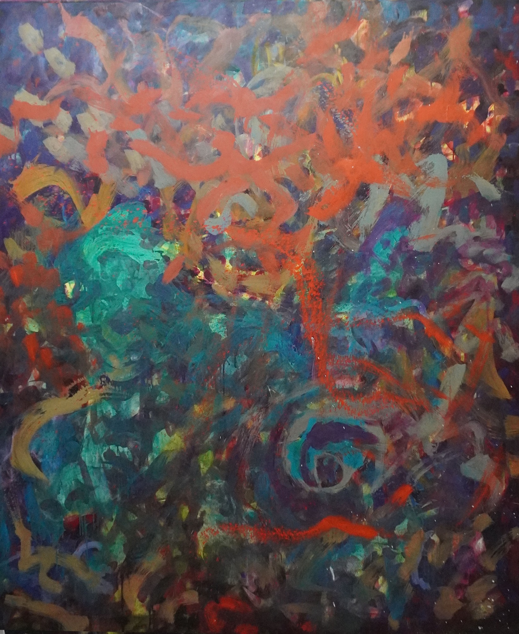 I saw the Birthday Party at their last gigs in 1984? Twice at the ballroom and once at Storey Hall, Rmit where I was studying. The music was so charged with sexual violence that it was difficult to depict. In this painting you can just make out Tracey Pew at the left and Roland and the right with Nick cave's face appering everywhere, including as the red bat shape above. Tracks: Six strings and Release the bats.