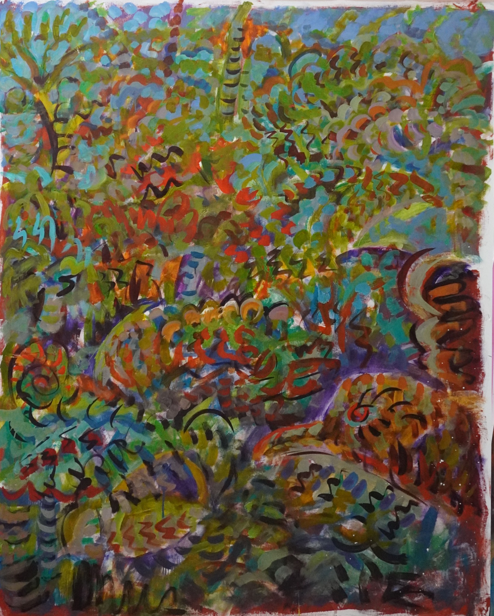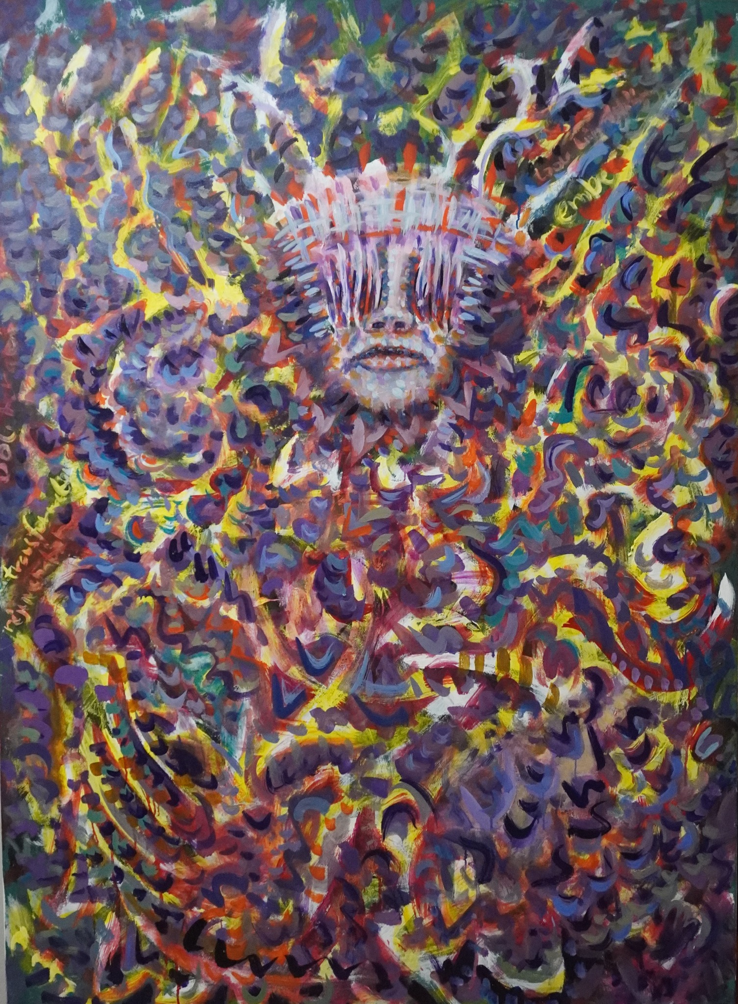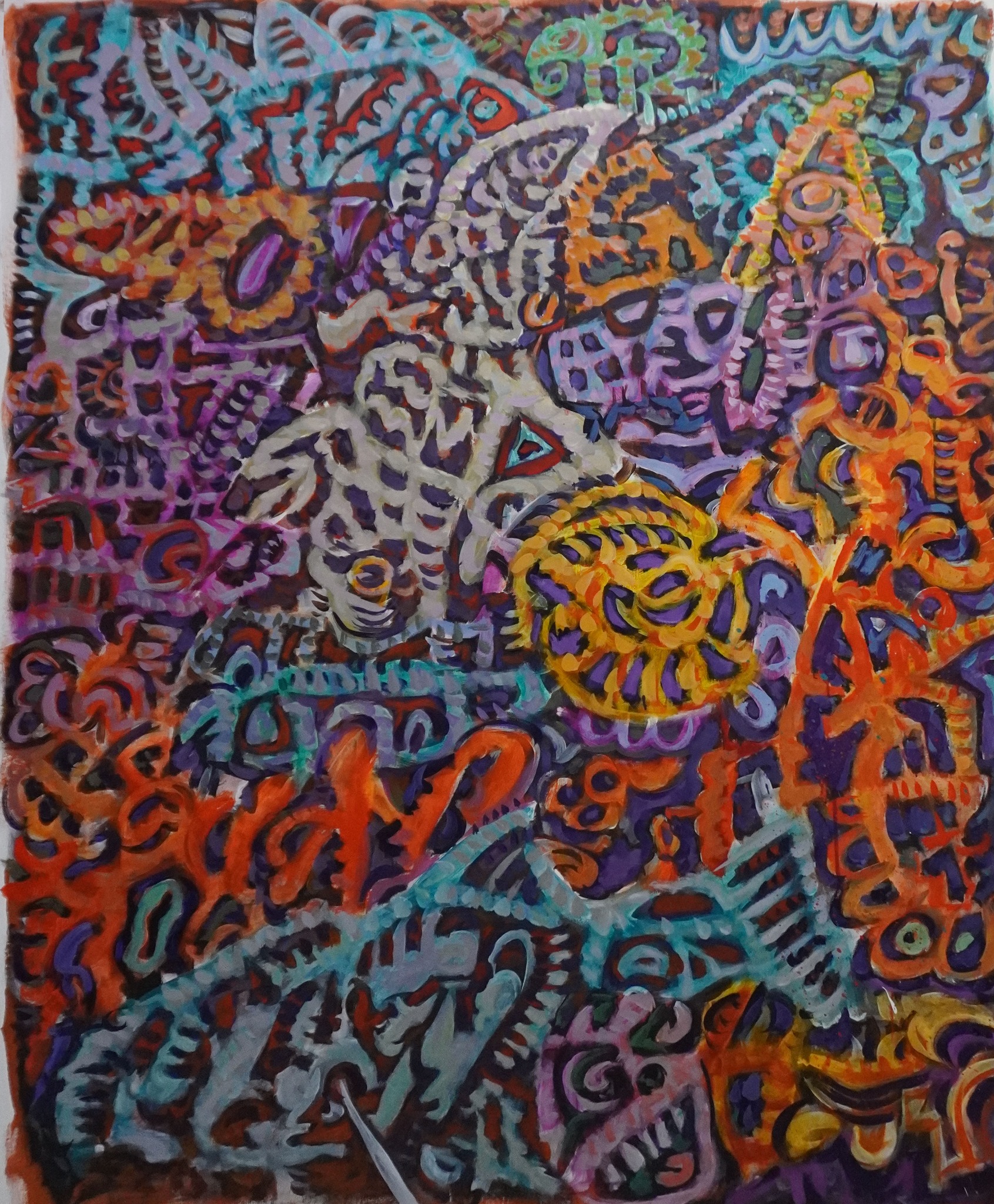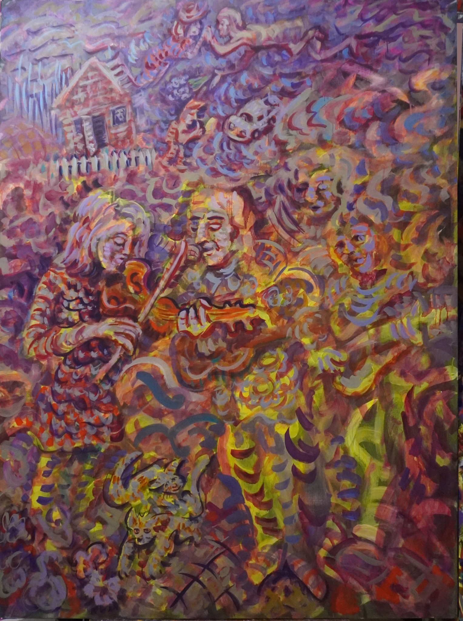 I saw the Birthday Party at their last gigs in 1984? Twice at the ballroom and once at Storey Hall, Rmit where I was studying. The music was so charged with sexual violence that it was difficult to depict. In this painting you can just make out Tracey Pew at the left and Roland and the right with Nick cave's face appering everywhere, including as the red bat shape above. Tracks: Six strings and Release the bats.